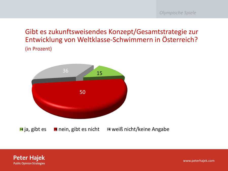 Eine aktuelle Studie der Meinungsforschungsagentur Peter Hajek Public Opinion Strategies zeigt eine große Enttäuschung, was die Ergebnisse der österreichischen Sportler bei der Olympiade in London angeht. Genau 42% der Befragten sind mit dem Abschneiden kategorisch gar nicht zufrieden. Andere 28% zeigen sich „weniger zufrieden“. Nur 14% sagen, dass sie mit dem Abschneiden des österreichischen Teams auskommen können. Besonders unzufrieden sind die Männer und die älteren Menschen. Unbefriedigend für die Befragten sind auch die Ergebnisse bei den Schwimmdisziplinen. Genau 32% der befragten Personen sagen, dass sie „gar nicht zufrieden“ sind, weitere 31% geben an, dass sie „weniger zufrieden“ sind. Die anderen Angaben: 18% sind eher zufrieden, 3% sind sehr zufrieden und 16% haben keine Antwort gegeben.