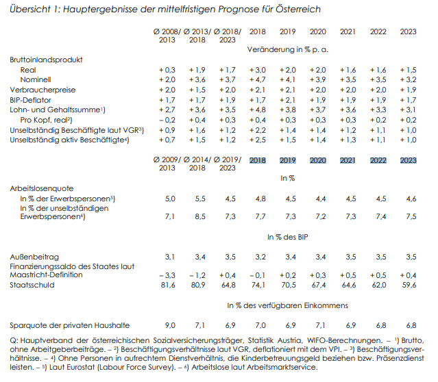 Seit der zweiten Jahreshälfte 2016 befindet sich die österreichische Wirtschaft in einem Konjunkturaufschwung, der im Jahr 2018 mit 3 Prozent Wirtschaftswachstum voraussichtlich seinen Höhepunkt erreicht hat. Danach wird erwartet, dass die internationale Konjunktur zunehmend an Dynamik verliert: Eine Entwicklung, der sich die österreichische Wirtschaft nicht (vollständig) entziehen kann. Für die Jahre 2019 bis 2023 rechnet das Österreichische Institut für Wirtschaftsforschung (WIFO) in seiner aktuellen mittelfristigen Prognose der österreichischen Wirtschaft mit einem durchschnittlichen jährlichen Wirtschaftswachstum von 1,7 Prozent (2014/2018 +1,9 Prozent). Das ist um ¼ Prozentpunkt mehr als im Euro-Raum. Geschuldet ist die günstigere Entwicklung in Österreich zum einen der besseren Ausgangslage im Jahr 2018 und zum anderen der stärkeren Konsumnachfrage vor allem in den Jahren 2019 und 2020. Diese ist auf die Steuerentlastung der privaten Haushalte durch den Familienbonus zurückzuführen. Für die USA und den Euro-Raum wird über den Prognosezeitraum von einem Wirtschaftswachstum von durchschnittlich 1,8 Prozent (2014/2018 +2,4 Prozent) bzw. 1,4 Prozent pro Jahr (2014/2018 +2,0 Prozent) ausgegangen. Im Prognosezeitraum werden die österreichischen Ausfuhren voraussichtlich real um 3,5 Prozent pro Jahr ausgeweitet (2014/2018 +3,7 Prozent p. a.). Der Anstieg der verfügbaren Realeinkommen wird in den Jahren 2019 und 2020 von der Lohn und Einkommensteuerentlastung der privaten Haushalte mit Kindern durch den Familienbonus geprägt. Dadurch werden in diesen Jahren auch der private Konsum und die inländische Konjunktur gestützt (+1,7 Prozent p. a., 2014/2018 +1,1 Prozent). Die wirtschaftliche Expansion ermöglicht bis einschließlich 2020 eine Ausweitung der Beschäftigung über dem Arbeitskräfteangebot. Damit geht ein Rückgang der Arbeitslosenquote (laut AMS-Definition) auf 7,2 Prozent einher. Ab 2021 dürfte das Arbeitskräfteangebot wieder stärker als die Nachfrage zunehmen. Bis zum Ende des Prognosehorizonts wird ein Anstieg der Arbeitslosenquote auf 7,5 Prozent erwartet. Im Umfeld steigender Preise für Mineralölprodukte und einer noch hohen Kapazitätsauslastung (die Prognose unterstellt eine zwar kleiner werdende, aber positive Outputlücke bis 2023) wird sich der Preisauftrieb mit 2 Prozent pro Jahr gegenüber der vorangegangenen Fünfjahresperiode etwas verstärken (2014/2018 +1,5 Prozent p. a.). Der seit 2011 teilweise beträchtliche Inflationsvorsprung gegenüber Deutschland und dem Durchschnitt des Euro-Raumes ist im September auf null zurückgegangen. Für den Prognosezeitraum wird mit einer Inflationsentwicklung in etwa im Gleichklang mit dem Euro-Raum gerechnet. Für die Lohneinkommen pro Kopf wird mit einem Zuwachs von 2,3 Prozent pro Jahr gerechnet. Das Differential aus Arbeitsproduktivität und Reallohnzuwachs dürfte sich über den Prognosezeitraum verringern, aber nicht schließen. Das Wachstum der Staatsausgaben wird im Durchschnitt der Jahre 2019/2023 mit 2,9 Prozent angenommen. Dabei wird für Bund, Länder und Gemeinden eine hohe Ausgabendisziplin unterstellt und nur eine mäßige Ausweitung von Verwaltungsausgaben und Förderungen angenommen. Ein deutlicher Ausgabenzuwachs wird aufgrund der demographischen Entwicklung bei den monetären Sozialleistungen (Pensionen und Pflege) und den sozialen Sachleistungen erwartet. Das Steuer- und Beitragsaufkommen entwickelt sich aufgrund der prognostizierten Einkommens- und Beschäftigungsentwicklung gut (+3,1 Prozent p. a.). Die Entlastung der privaten Haushaltseinkommen durch die Einführung des Familienbonus dürfte den öffentlichen Haushaltssaldo im Jahr 2019 mit gut 400 Millionen Euro belasten. Im Folgejahr, wenn auch der über die Lohn- und Einkommensteuerveranlagung bezogene Anteil des Familienbonus wirksam wird, dürfte sich der Budgetsaldo um weitere 700 Millionen Euro verschlechtern. Dennoch zeigen sich die Lohnsteuereinnahmen über den gesamten Prognosezeitraum besonders dynamisch, da keine Maßnahmen angenommen wurden, die die Auswirkungen der kalten Progression verringern. Unter den Annahmen des prognostizierten Konjunkturverlaufes und der wirtschaftspolitischen No-Policy-Change-Annahme sind ab dem Jahr 2019 Überschüsse im Staatshaushalt möglich. Die Staatsschuldenquote würde in diesem Szenario von 74,1 Prozent im Jahr 2018 auf knapp 60 Prozent im Jahr 2023 sinken. Ob dies gelingt, hängt vor allem von der Budgetdisziplin der Bundesregierung ab. Im Regierungsprogramm geäußerte fiskalpolitische Vorhaben und Pläne zur Dämpfung der kalten Progression sowie angekündigte Reformen in der Einkommens- und Unternehmensbesteuerung wurden in dieser Prognose noch nicht berücksichtigt. Des Weiteren würde eine deutlich schwächere Wirtschaftsentwicklung als in der Prognose angenommen zu geringeren Staatseinnahmen und höheren Ausgaben führen, wodurch sich der Budgetsaldo verschlechtern würde. Insgesamt unterliegt der dargestellte Budgetpfad einem ausgeprägten asymmetrischen Risiko einer ungünstigeren Entwicklung.