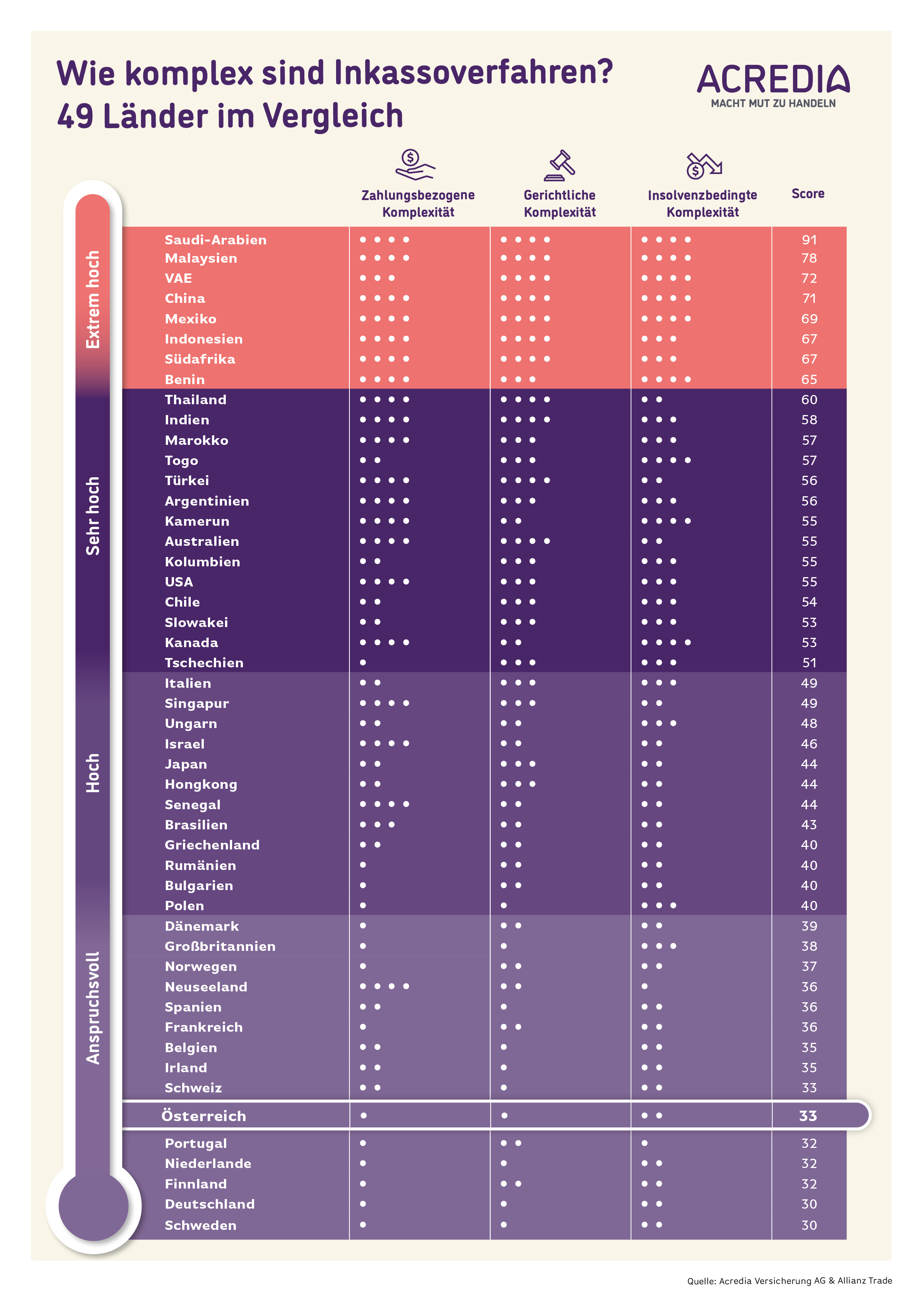 Die Experten analysierten über 40 Indikatoren rund um lokale Zahlungspraktiken, Gerichts- und Insolvenzverfahren. Das daraus resultierende Ranking reicht von einem Score von 0 (geringe Komplexität) bis 100 (sehr hohe Komplexität).