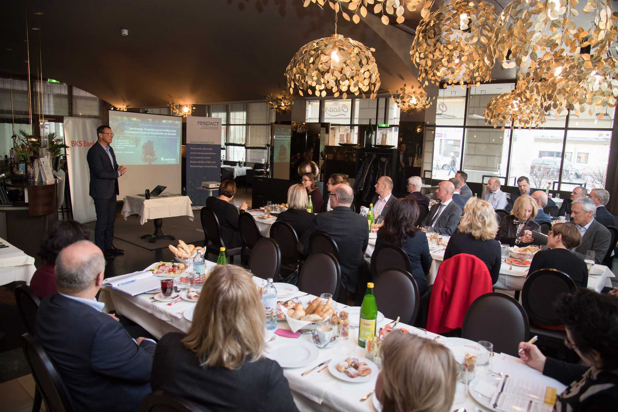 Rund 30 interessierte Unternehmen nahmen am Event teil, um sich am Diskurs über den zukünftigen Einsatz von Kunststoffmaterialien und deren kreislauforientierte Wiederverwertung zu beteiligen. respACT fördert als Österreichs führende Unternehmensplattform für CSR (Corporate Social Responsibility) den interdisziplinären Wissensaustausch, um verantwortungsvolles Handeln im Sinne einer Kreislaufwirtschaft voranzutreiben. Mag.a Dr.in Herta Stockbauer, Vorstandsvorsitzende der BKS Bank, respACT-Vizepräsidentin und -Landeskoordinatorin für Kärnten, begrüßte zum CSR-Frühstück mit den Worten: „Die Kreislaufwirtschaft eröffnet Unternehmen eine Vielzahl an Möglichkeiten, positive Beiträge für Umwelt und Gesellschaft zu leisten, sei es durch Produktdesign, Reduktion von Einwegkunststoffen oder Verwendung von Sekundärrohstoffen. Innovative Lösungskonzepte für einen nachhaltigen Umgang mit Plastik sind heute mehr denn je gefragt.“ Die Veranstaltung wurde gefördert von der Austrian Development Agency.