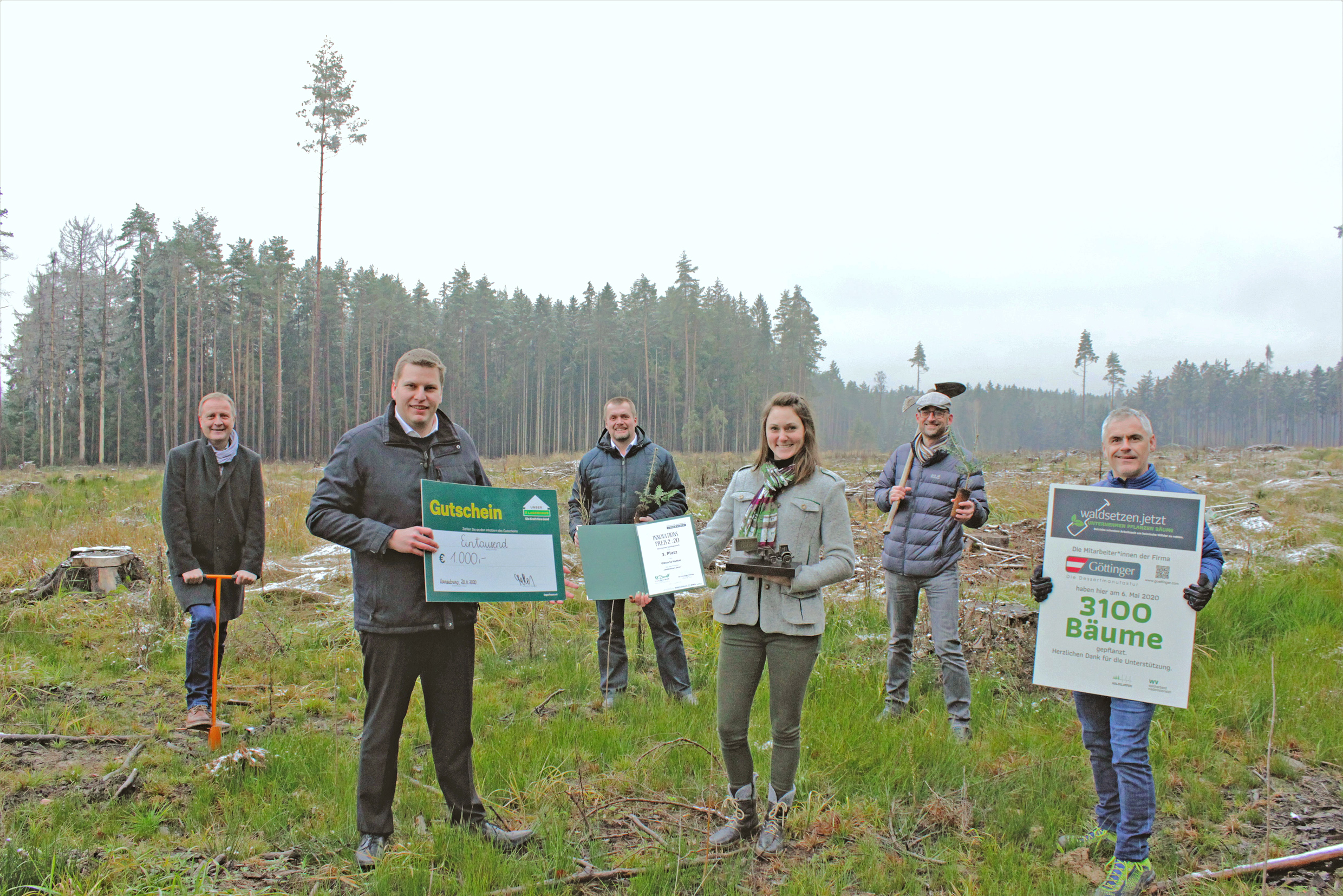 Gemeinsam mit Ihren Projektpartnern Thomas Göttinger und Manfred Ergott freute sie sich über diesen Preis, der nun tatsächlich in einem ungewöhnlichen Rahmen überreicht werden konnte: Um niemanden zu gefährden und weil es thematisch gut passt, traf man sich am 12. Dezember bei jener Waldfläche, auf der der erste Projekteinsatz erfolgte. Die Firma Göttinger Dessertmanufaktur aus Groß-Siegharts hatte hier im Mai 2020 an einem Aktionstag 3100 Jungbäume gepflanzt.
