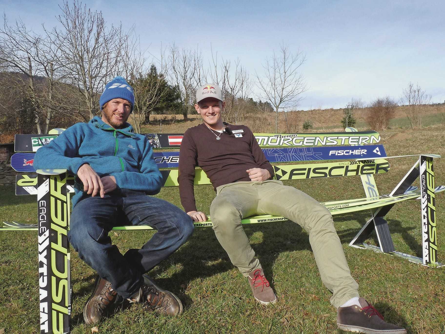 Skimöbel-Chef Jakob Lederer (li.) mit Skisprungstar Thomas Morgenstern, für den er eine Bank aus seinen Skiern gebaut hat.